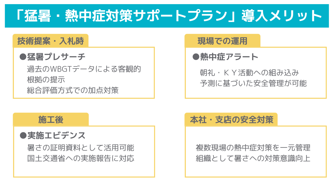 2025年末に国土交通省で策定された「建設工事における猛暑対策サポートパッケージ」。この仕組みをフル活用できるよう、気象会社だからこそできる支援を盛り込んだプランが「猛暑・熱中症対策サポートプラン」です。